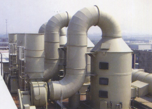 逆流式廢氣洗滌塔是將生產(chǎn)過程中產(chǎn)生的廢氣經(jīng)收集系統(tǒng)導(dǎo)入廢氣洗滌塔后,流經(jīng)填充層時(shí),洗滌液自噴嘴均勻噴灑于填充材料之表面以保持濕潤(rùn),同時(shí)廢氣與洗滌液在充分潤(rùn)濕的填充層相互接觸,藉由物理與化學(xué)吸收作用將廢氣中的污染物吸收于洗滌液中,達(dá)到去除污染物質(zhì)的目的,然后此飽含水份的氣體經(jīng)過除霧層以移除多余的水份。經(jīng)過洗滌塔洗凈并移除水份后的潔凈氣體即可直接排放到大氣中,而所移除的水份也可被導(dǎo)回循環(huán)洗滌液系統(tǒng)重新回收使用。